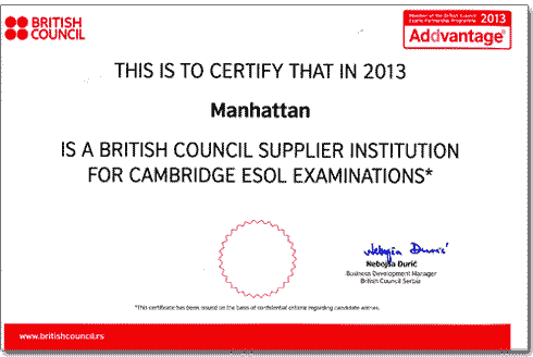 Želeo bih da Vam čestitam sto ste izabrali da Vaše dete uči engleski jezik u školi jezika Manhattan iz Užica. Ova škola sarađuje sa British Council-om, i tu se možete spremiti da nakon kursa jezika svoje znanje ozvaničite polaganjem međunarodno priznatih ispita u British Council-u.